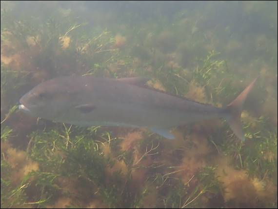 Still after having made the effort to get here I decided to keep going to see if it would clear up a little further out. Patches were indeed better, but the usual fish life was somewhat wanting today. I came across a few fish other than the above Horseshoe Leatherjacket, they however kept their distance and hid in the weed when I came too close. The only other find worth mentioning was what I think is a Tailor, a large recreational fish growing to 1.2 meters long. This solitary fish was close to a meter long and cruised past me keeping an even and steady pace, as if to say don’t even bother trying to catch me: