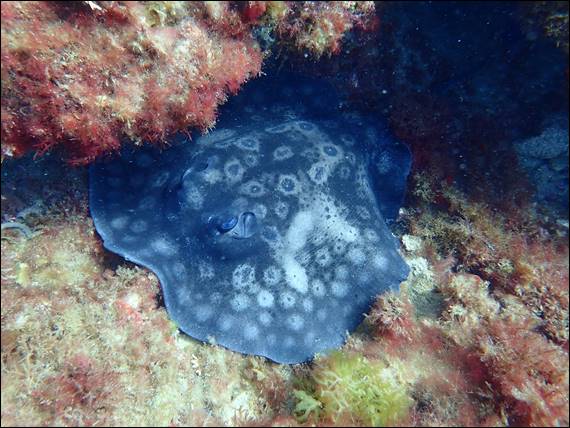 The above sea star also stood out so I snapped this image as I swam above it on my way back to Rongy. The shape seems to be similar to the Echinaster genus of sea star, so I am guessing that this is what I found. I have previously found a white version of this sea star in early 2020 but never had it confirmed: https://sandbagged.blog/2020/01/27/the-old-stomping-ground/. Rongy was also keeping an eye out for finds and pointed me towards this ray. It would have been great to again take my time and get a bit closer to confirm which one it is, but the patterning gives me confidence in saying it is a Spotted Stingaree: