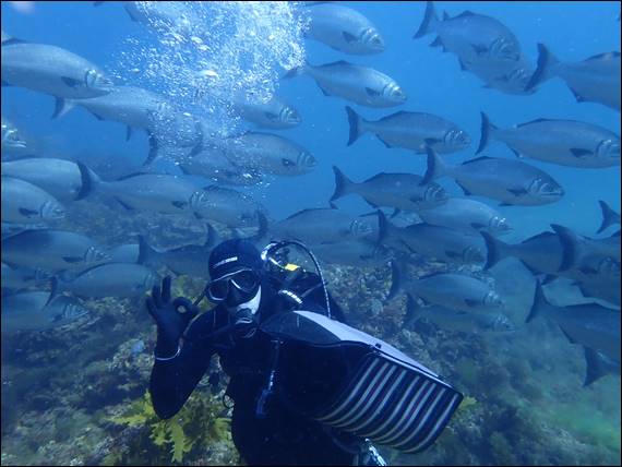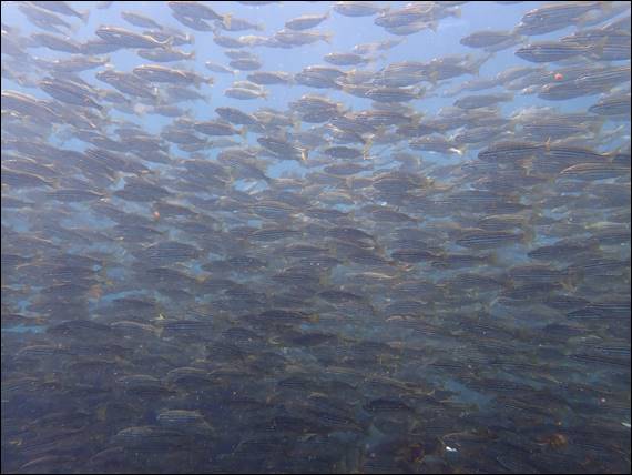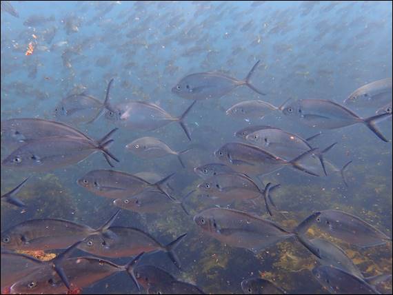 The water had reasonable visibility but it was not super clear. Each time Rongy handed me something to take back to the crate I had check my surroundings and guess which way to go. I’d look for the anchor chain and rope, and then the less visible rope attached to the haul crate. I somehow managed to find Rongy again on each return trip, but for a period that became really easy. A huge shoal of large Southern Silver Drummers, that reach 75cm in length, came towards us and swam round us like a tornado for what seemed like ages: