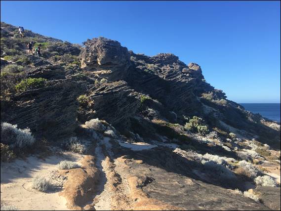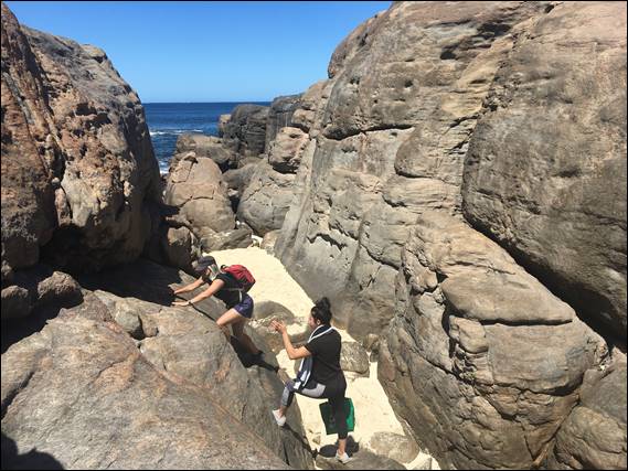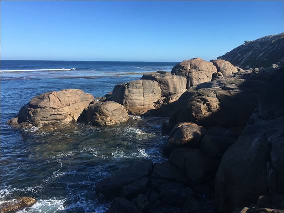 We couldn’t hang about for too long as we were due to meet Lou and Glen, and as we carried on I made a mental note that I should one morning come out this way to do a spot of bird watching. We were heading out to a spot Glen had stumbled across while exploring the 4WD tracks and coastline, another reason today would be a little different. Glen, Lou and I had been talking about this place for a few weeks now, and today it so happened we were all three available. He drove in and got us to a parking spot with a view. From here it was a ten minute walk down the dune, through amazing limestone formations and over granite boulders: