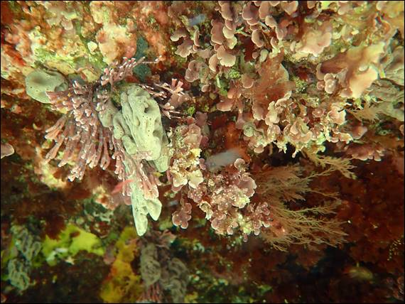 A few familiar fish came to view including drummers, morwongs and sweeps, but were quick to dash under the cover of the ledges. I went down looking for them but they went in too deep for me to see them. The edge of the reef had narrow crevices cutting into it that looked to open up at the bases into caves, but with the swell it felt too dodgy to swim into them and duck dive down. After hunting the edge of the reef and ledges for some time, with no new or exciting finds I took a couple of images of the colourful array of sponges, bryozoa, and weed hanging onto the underside of the ledges: