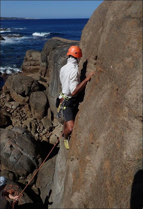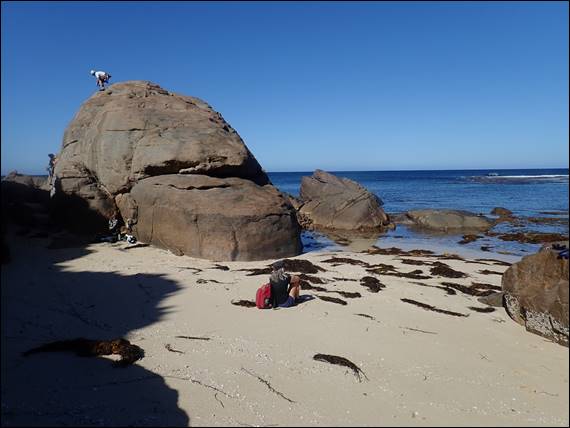 The only other place I could think to try and find where all the fish were hiding was along the boulders. The water was certainly deeper here and it looked a great place for them to be shoaling, but it was also where the swell had the greatest impact and after narrowly missing being thrown against the granite walls several times I decided it was time to get out. Back on the beach Glen was atop the first climb, and Lou was following up. It seemed that it had taken a while to sus out a line , get ready and climb it. It was his first lead in a while so it was great to see, and chatting to them he reckoned no more than a grade 8 while Lou scoffed and said a 4: