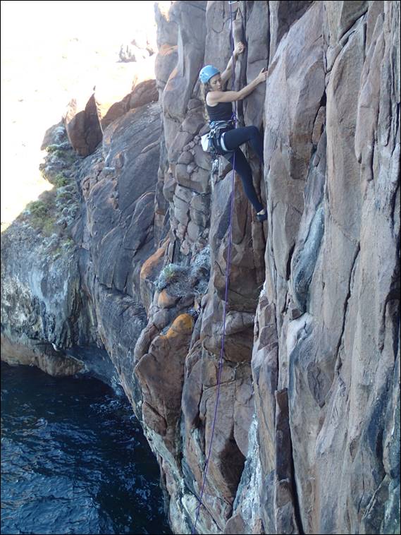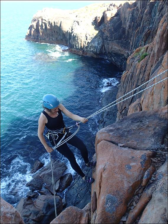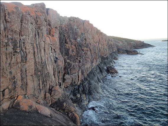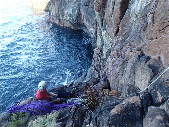 The rap down was fine, but maybe a bit more warning that we would be belaying off a narrow ledge with nothing but a 15m drop straight into the ocean below would have been nice. But as with most of the situations we have thrown at her, she took it in her stride. It was evident as we rapped down that despite all the hot 30 plus degree days we have been having the rock was damp. I thought at the time it may have been the rain that came through a few days back, but the observation history indicates this area only got a few millimetres: