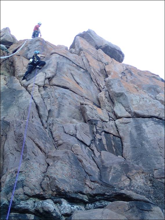 What with the wet rock Rongy led back out up the Escape Hatch at a very cautious pace, and looked to be shaking out a bit more than I would expect on a grade 16 route. Without mentioning it I was getting a bit nervous as to how Jaime would go. The whole situation of the exposed belay ledge, wet rock and having watched Rongy not struggle but having to be so careful must have been a bit an unsettling. While the crux move proved a challenge she did really well and worked her way higher and higher, even managing the steep moves up the final wall:
