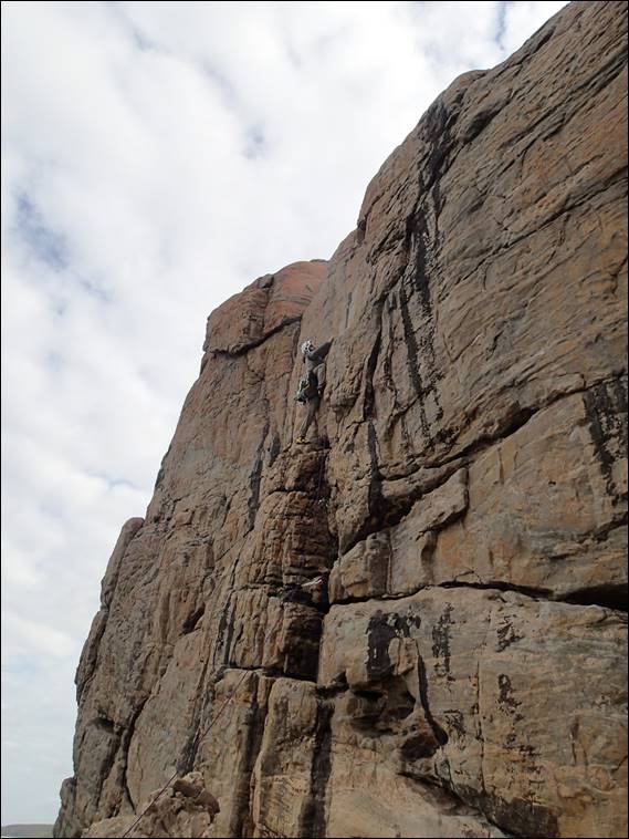 There is then a line of three bolts that leads up the steep wall, and only after then there is a need to use some trad gear in a horizontal break before ascending the top slabby wall. This allowed him to feel comfortable with leading and only need to use trad for a small section. Before he set off there was a quick lesson in placing cams, and he placed two in the break for me to inspect. The key things I had mention was not to over-cam them so they would be hard to get out, consider direction of fall and make sure they don’t walk in by extending them: