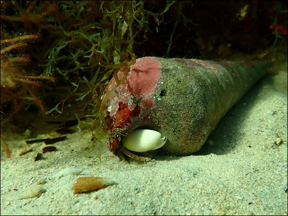 Some in large numbers such as the Herring others isolated such as the Herring Cale. There were also lots of Bell Clapper shells littering the small sandy areas in-between the reef. At night time these shells, or more correctly the creatures that live inside them move about the floor leaving a trail in the sand, as the large home is dragged along. Keen to see if I could find one of the inhabitants, I went down checking them out and was in luck. The claw and a couple of legs from a Hermit Crab poking out from this one, and quickly retracting when it realised I was watching: