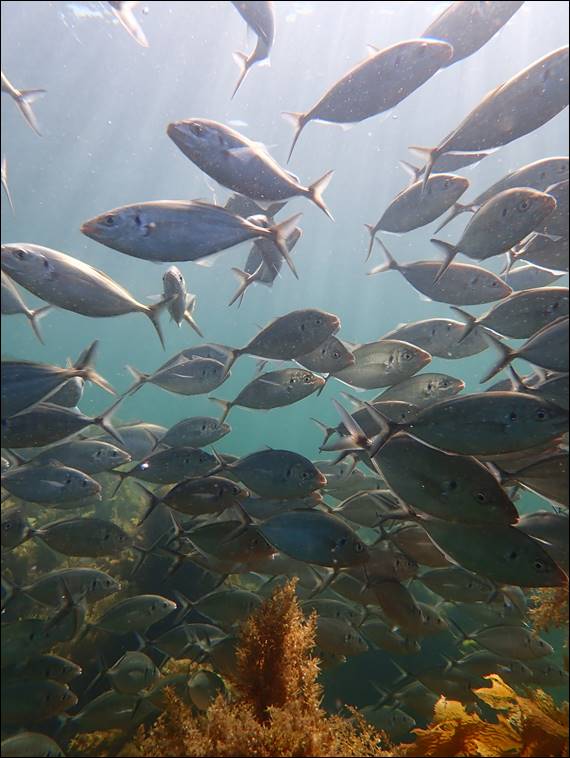 The fish that I spied in good sized shoals were Herring and Buff Bream, these would spot me and go round me. Then came along a large shoal of more sleek slivery looking fish, probably a thousand of them or more, and they were heading right for me. The school of White Trevally hung about unafraid of me and when I ducked dived down they circled me, only to continue on a more linear path as I went back up to the surface. Never seeming to be in a rush to get away allowing me lots of time to interact with them: