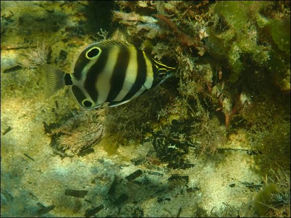 With all the sheltered areas round this reef I found quite a few juvenile fish, but these ones were the most prolific. I came across them several times in large numbers, and haven’t seen them off my local beach. The deep abdomen with a body that tapers off to towards the tail, a relatively large eye and prominent dorsal fin makes me think they maybe young Bullseye. Quite different the juvenile Gobbleguts in my last fishy post, including having an orange spine. It is hard to get good image of small and transparent fish; the camera focuses on the background: