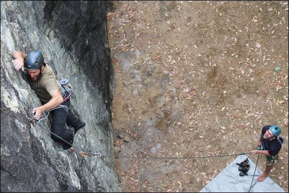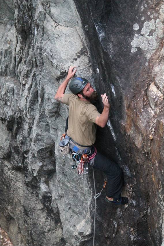 Howsie and then Mikey went next and neither of them fare so well, the first and second clip isn’t too bad. A few small holds and long reaches can get you there, but between the second and third clip it gets serious. Non-stop action, that you need to tackle at a steady and controlled pace. It is not until your feet are above the last draw can you reach the next clip, and even then making that clip feels tenuous and scary. If you don’t make it there is plenty of air time that awaits you, as they both found out on numerous occasions slowly wearing down their stamina and shredding the skin from their finger tips: