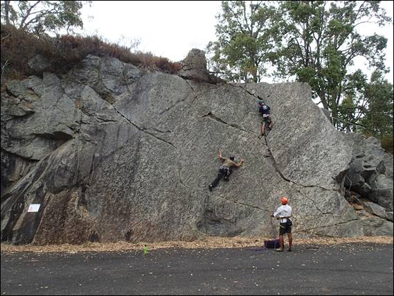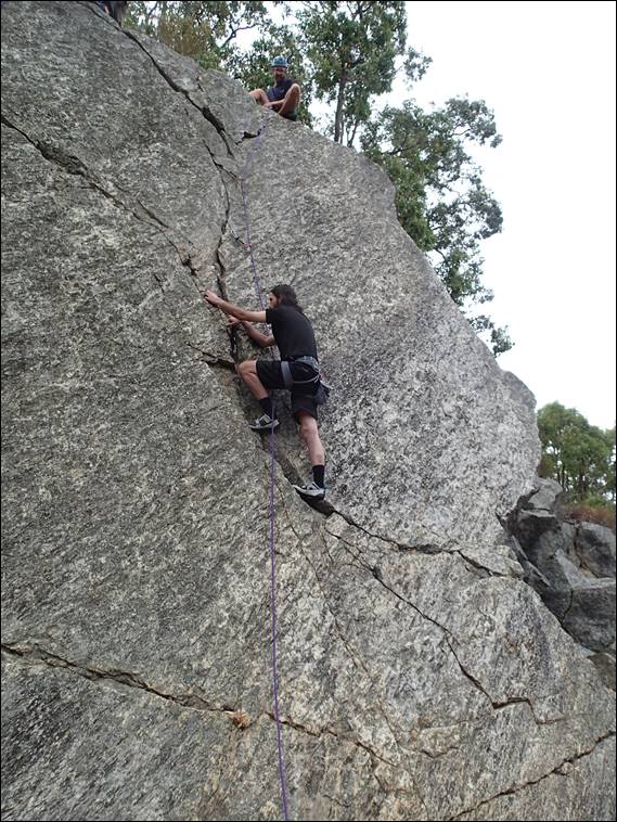 So with Andrew having been beaten by Murky Corner, after a valent effort and trying in a determined fashion while being strongly encouraged and tutored by the three of us below, and Howsie and Mikey finally deciding they needed a break we had a change of scenery. On our last trip here Rongy had talked up Irish Stew, one of the fine but short slab routes straight off the carpark. This wall also has a route that we felt Andrew would have a far better chance of getting up. So Howsie hit Irish Stew while Mikey climbed The Crack, with me belaying both of them at the same time: