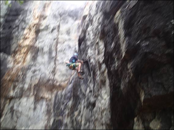 Andrew had a crack at the corner, while needing to learning all the basic techniques. This included that it is best to keep on your toes and not the sides of your feet as son many new climber do, as this allows you more ability to twist your legs; using your core muscles to pull into the wall, and take the weight of your arms; not over gripping with your hands, and learning to relax even when you are scared; resting when you can, and focusing on breathing to help you relax; and most importantly use your feet and legs, they are after all the biggest and strongest muscles you have. It was a huge ask on the steep and technical walls at Welly Dam: