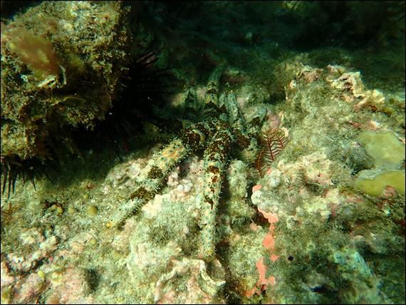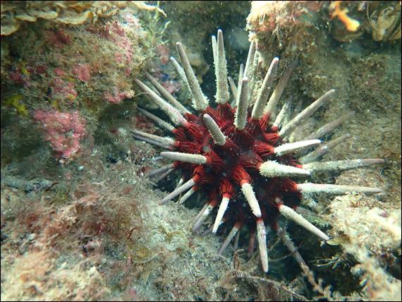 Being a carnivorous sea star it feeds on small crabs and marine worms, and is different to most sea stars as it has four rows of tube feet on the underside of their arms. Most other sea stars only have two rows. I’m guessing, but this may be why it is able to move so much quicker or it may be so it can hold onto its prey. I also came across another Western Slate Pencil Urchin, and this one was in a brighter location allowing a clearer image. Due to not having as many spines as other urchins these are more vulnerable and as a consequence wedge themselves in cracks. This in turn rounds off the ends of their thick spines: