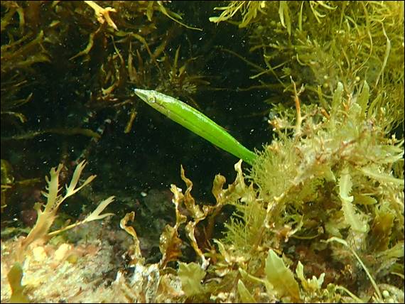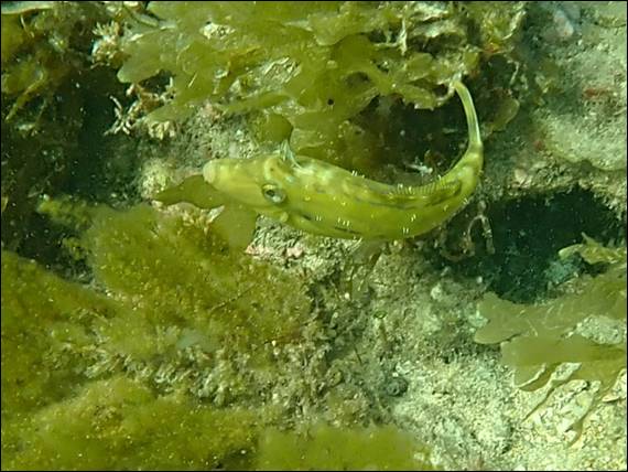 My discovery of small beautiful fish continued. Next I spotted a short, maybe 50mm long, slender but distinct stripe of green that stood out and seemed to be moving. The green was fluorescent and mesmerising. I was able to dive down away from the area and sneak up from below. While I didn’t move or moved very slowly it was fine. It did however dart for cover a couple of times, and as I sat there waiting patiently it popped back out again. Yet another juvenile and again I’m stuck between two species, either a Weed Whiting or Cigar Wrasse: