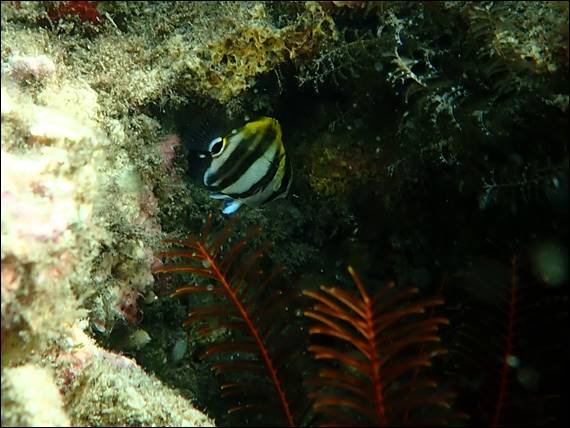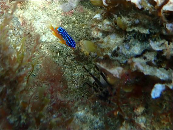 While I saw lots of other juvenile including Hulafish, Gobbleguts, Pomfrey, etc. these were all in small shoals and I have included images of these previously. The last fish that I wanted to include in this post was again solitary, and looked simply stunning. The blue patterning certainly didn’t help it hide and despite the depth it was at, how could I miss the blue dot moving about. Another tiny find maybe 20mm long that looks like a Fire Damsel, but they do not come this far south. So the search continued and with a bit of help from Rongy it has been identified as a juvenile McCullochs Scalyfin: