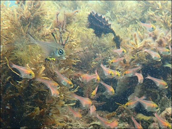 I also found the above shoal, which was swimming with a shoal of small Western Pomfred. As I approached all the Western Pomfred peeled off and put distance between me and them. These fish did not however seem as fussed. They are all juvenile bullseye, mostly Rough Bullseye but there is one that stood out with its black and yellow pelvic fins. This one is a juvenile Bigscale Bullseye. What is interesting is that bullseye when fully grown hide in dark caves and are quick to run, but these juveniles seemed more at ease in the relative open water and with me poking my camera at them: