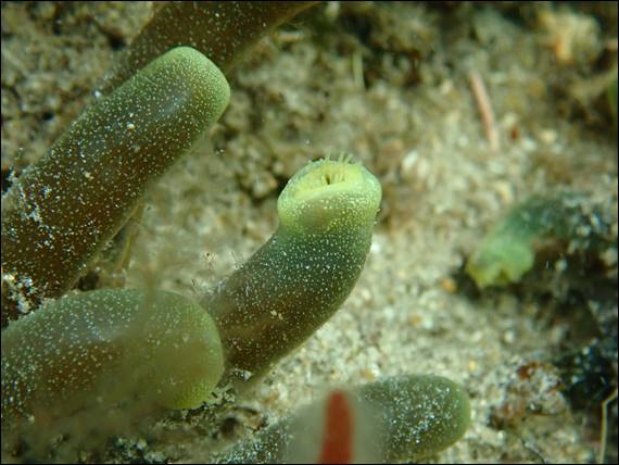 I stayed out for a long time just enjoying watching the fish and not bothering to chase them for a snap. I was however curious with what looked like a clump of Slimy Bags, but the shorter length and speckled colouration made it obvious it was something different. Diving down I noticed the opening at each tip and some had small yellow tentacles protruding. It is called Zoanthus Robustus although I have not been able to find out any more information about it, so I am not sure if it is like a filter feeder or an anemone: