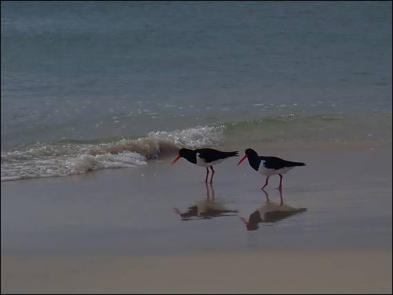 As I came out from my morning dive, unbeknown to me, I was followed by a couple of reasonable sized rays. I didn’t spot them until I had taken my mask and flippers off, and while I managed to get my mask on to take a quick look at them they didn’t hang about. So knowing that the rays are about, as a heap of people on the beach told me they had seen lots of them, I decided on a second dip in the afternoon. The water was again flat and calm, allowing a couple of Oystercatchers to probe into the sand for a feed: