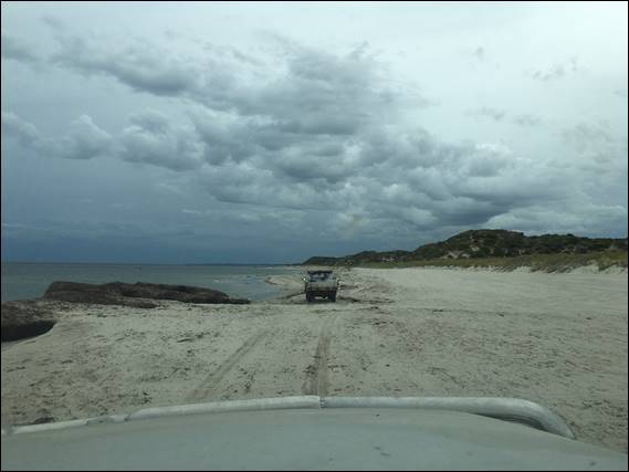 The clouds from yesterday were intensifying and a threat of rain was on the way for later in the day. A stiff seaward breeze was also present and it felt chilly but Geoff, Nana and Ben were keen to get out so we all drove along the beach past the river mouth. The beach was starting to change, the sand didn’t look that flat, gently sloping, clean white that we come to expect in summer. It was more rutted and weed was springing up here and there, mounds of sea weed were forming along the water’s edge and where it wasn’t present the beach had a steeper angle into the water: