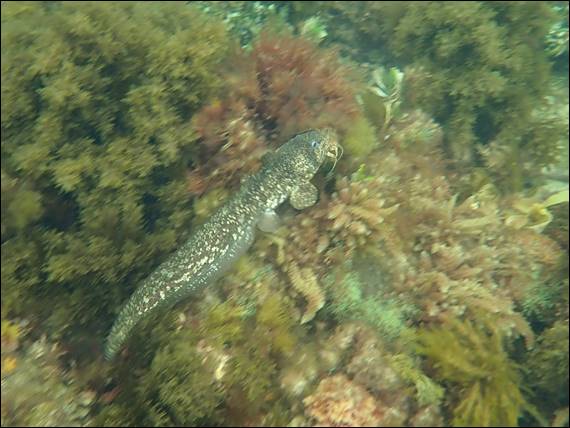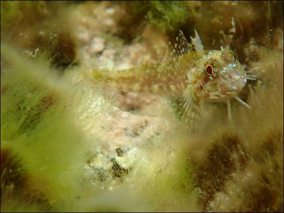 I did however come across the above fish, one that I have seen previously as it quickly hops about clinging on to the more exposed rocky reef. It is no more than 80mm long and extremely well camouflaged. I thought it may be a goby, but now feel that it is probably a Common Threefin. These are often mistaken for gobies but what distinguishes them is a more pointed snout and also the pectoral fins are divided into two fins. Soon after snapping the above image I headed back through the near shore murky waters, keen to get a hot tea down me: