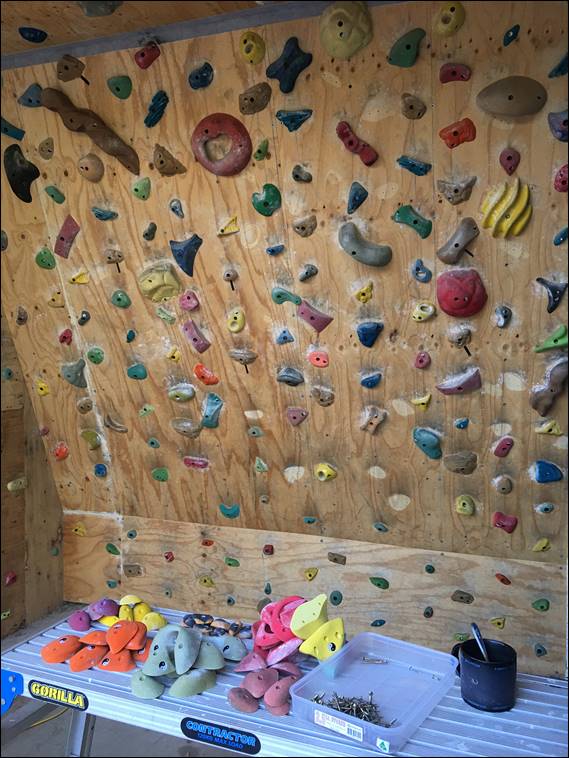 I’d already spent several hours at it before the boys had arrived so was more than happy for them to take the tools. This allowed me to sort the holds they took off for easier use later on. The three of us operated like a well-oiled machine and we had sped along with the job, and were getting more done than I had expected. By mid-morning the wall was stripped and 300 plus holds were laid out in neat piles ready to be put back up: