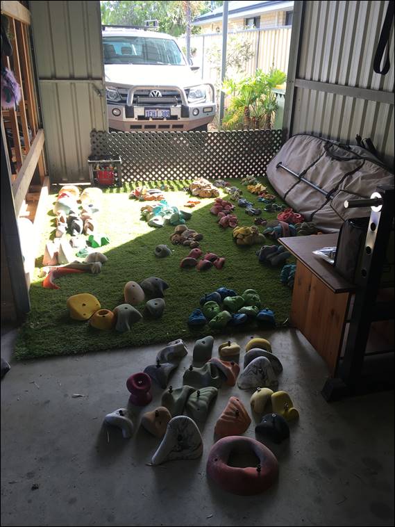 In late 2017 I started to build my boulder wall with the help of Craig, and it was Craig and Geoff that then helped me set the 150 odd holds I had bought. Looking back at the post (https://sandbagged.blog/2019/01/06/finally-my-boulder-wall/) the wall looked shiny and new but also the spread of holds looked very sparse. I was lucky in to get back in touch with Eric in late 2018, just about when he decided to sell all the holds from his boulder wall and so I could remedy my concerns with an additional 150 plus holds which Geoff, Nana and Craig helped to place: