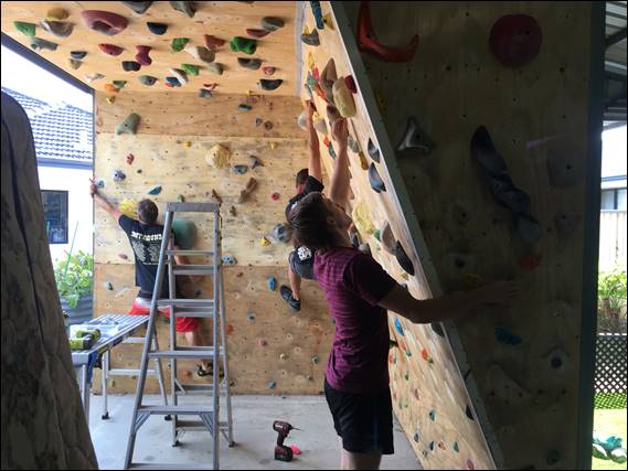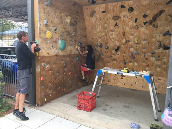 With Alan and Tomski’s help we had done a great job in having the wall ready for the serious route setters to come in and do their thing. Saturday morning arrived and it was time for the larger sets of holds were to be placed, and this meant that the boys spent a lot more time thinking about which set of foot holds they wanted to use and how they would place the holds. The sticky boots came out straight away so they could test each move. It was a much slower process but it’s not the sort of thing that can be rushed: