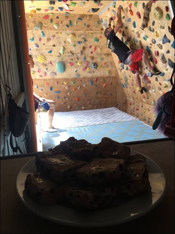 With four of us setting routes it got quiet congested but we managed to work round each other well, the idea was to ensure that there was a range of difficulties. But every so often a remark would come out that “oh that’s a great move but it’ll be tricky”. I have to admit that it felt like we wouldn’t get the job done, despite the boys being available to help till mid-afternoon. The more thoughtful approach required, plus all the chit chat, was slowing things down. So I applied a little pressure when relevant and kept the tea and snacks flowing to keep them going: