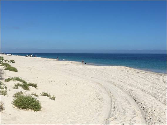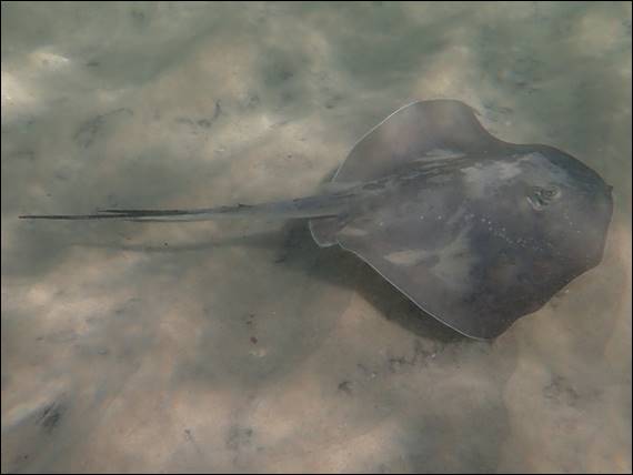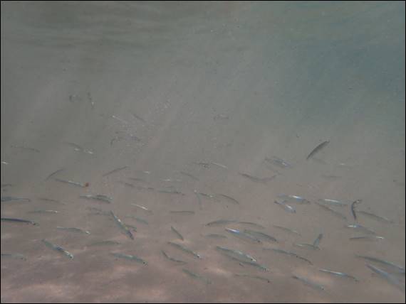 Despite being mid-morning it wasn’t as busy as I expected. No doubt the other end of the beach where we sometime drive would be packed, offering longer stretches for the city folk to drive their cars on the sand. There were however a few cars parked-up and there was even one crew getting ready to put a jet ski in the water, um. I decided to make a mental note of that as I went in the water. No wetsuit today just shorts, and the water felt good. Not the cold I was expecting. It was also calm and clear allowing a great view of the ground below: