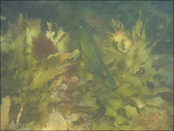 Over the season the times of the hide tides having been creeping earlier and earlier in the day. At the start of the season the morning snorkel would have been at low tide, and while this may only make half to three-quarters of a meter difference it is definitely noticeable. So now when I go in, which is at hide tide, due to the extra depth to the water column having good light is important. There seemed to be lots of fish about, no large schools but plenty to see. Above is an elusive Spiny Tailed Leatherjacket. Today I didn’t dive down to check it out knowing it would just dart away, instead merely watched from above: