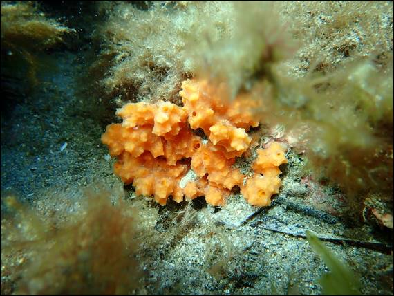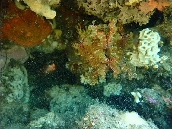 I did however go down every so often to see what was to be found, quietly still hoping to stumble across a few more nudibranchs. The bright orange shown above occasionally attracted my attention and each time on closer inspection was found not a nudibranch. So I am still unable to make use of Nana’s new book on them. The above I believe to be either a sponge or compound ascidian, and is still very beautiful to see. It was on one of these exploratory dives I saw a movement that intrigued me:
