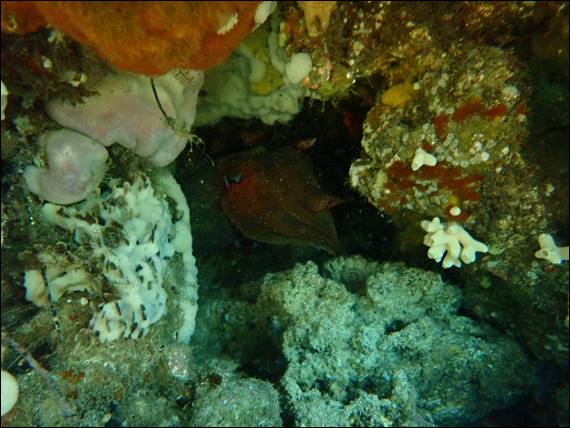 After looking round for ages trying to find it again I gave up, in the open ground it is hard to distinguish where you are, cursing the jet ski owner. Eventually I moved on in search of other new or exciting finds. Despite looking in many caves and under many ledges, while I saw heaps, there was nothing worth reporting on. Except that is when a cuttlefish, no doubt startled by my sudden appearance, looked to be attacking me. It’s skin went rough and its tentacles became contorted, as it made a couple of aggressive approaches at me (above). After which it went back into the protective recess away from me, and only then returning to the usual smooth skin (below):