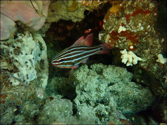 I noted the bommie position that was very distinctive and left it alone to settle down. After pottering about a few other bommies nearby I headed back to see if it was still there. This time ready to try and video the experience. But it wasn’t, or it was hiding deeper in the matrix of holes under the large bommie, and the entrance was now being guarded by a Western Striped Cardinal Fish. These fish only grow to approx. 14cm or six inches long and this one looked fully grown. If you compare the images above it will give you an idea of just how small the cuttlefish I saw was, it really was just a baby: