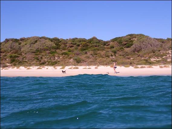 I followed the ray about for a bit and even took a video, as it circled round me seemingly not wanting to head out to the deeper water. It is the first time I have seen one of these rays, and really clearly seen the distinct white dots on its pectoral fins (or wings). Eventually I did brave going out and left the ray in the near shoreline. While I could see the bottom it was not clear or calm, as the image of Lisa walking the poodles is evidence of. I carried on regardless for a while diving down and looking about but today I started to feel cold quickly, which may have had something to do with having been out climbing since the early morning and then heading straight down for a swim: