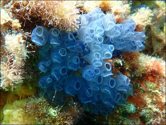 As I swam between the boulders and looked at the walls for interesting finds, I spotted these Blue Throat Ascidians. While they look like plants they are animals and are closely related to vertebrates like us. They have a circulatory system, digestive system, heart and other organs. And while they don’t have a backbone and ribs, though it looks like it through their transparent bodies, they do have a long nerve running the length of their body in the same way our spinal column does. Amazingly, despite being only a few centimetres long they can pump a hundred litres of water in a single day: