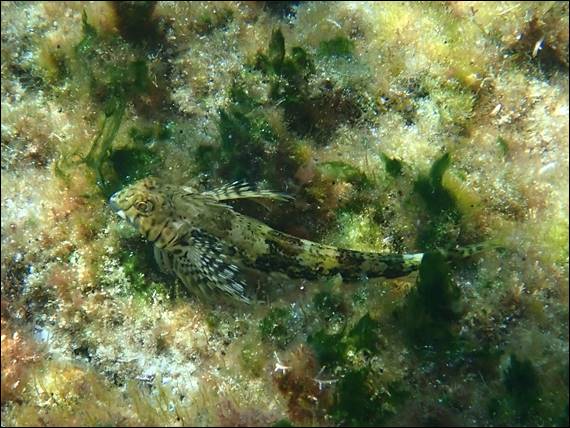 There were so many other fish to report, plenty that I have not as yet seen off our local beach. But there is only one more that I wanted to include. We both spotted it lurking under a boulder, with just a fraction of its tail visible. Duck diving down it didn’t seem perturbed by our curious gaze and interest, merely lounging about on the edge of the boulder in the shadows. We left it to its hidey hole and drifted off. Once we started to get cold we retraced our path, and on the return trip I stopped to see if this fish was still about: