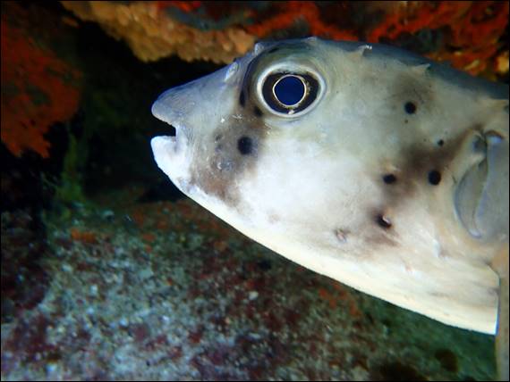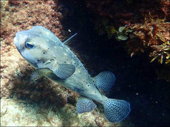 It was and this time it lazily swam out from under the boulder and seemed to move in numerous directions allowing me a view from every angle I could ask for, before then lazily heading back under the cover of the boulder. I thought it was a puffer fish of some sort, and have narrowed it down to a Spotfin Porcupinefish. These fish can grow to 75cm and I’m guessing this one was just over 50cm. They can inflate their rotund body if they feel threatened but despite us swimming right next to it, so close my camera wouldn’t focus and I could touch it, it refrained from putting on a show: