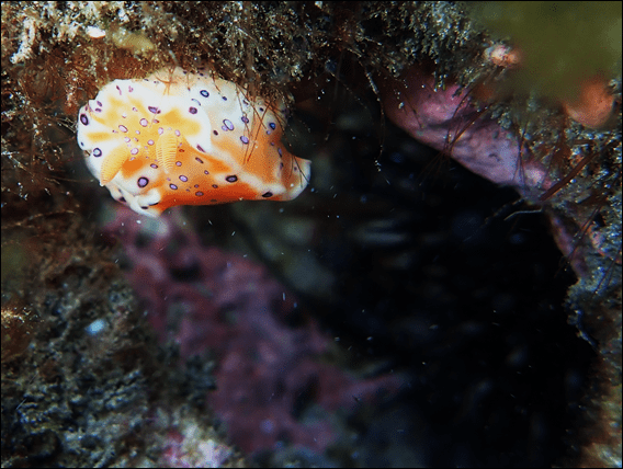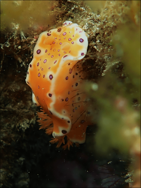 Despite the turbulent and turbid conditions, and I have no idea how she saw it but, Nana called me over. She had found a nudibranch, and I eagerly swam across to where she was. Sure enough two to three meters below us a small splash of orange could be seen intermittently, as the weed was obscuring it from sight half the time as it rhythmically moved with the swell. It looked to get dislodged for a moment, hanging on desperately by its tail and then reattached itself under in a small pocket out of sight: