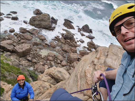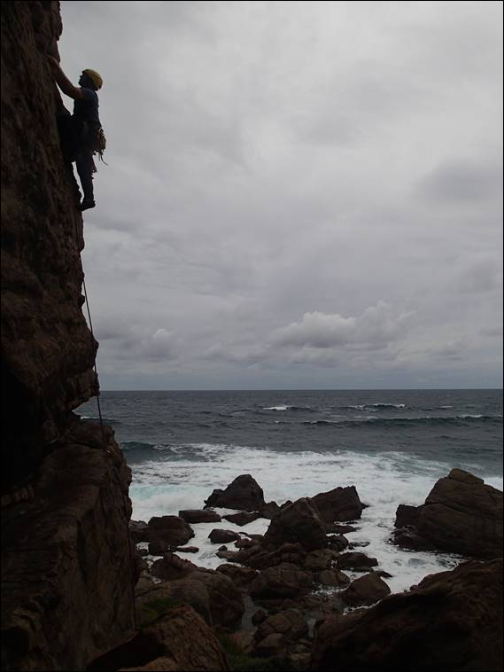 The clouds out west started to take on a more menacing look. No matter it looked like we had a good hour before the distant belt of rain would hit us. As I climbed I could hear another abseiler whoop and holler their way down the mighty Steel Wall. I waited till close to the top of my line to get that trusty hex into another sweet placement, and as I was looking down to get the all-important image I could see Steve taking images of what was out west. I didn’t need to look out to sea to check what had caught his attention, once the image of the hex was taken I felt the first drop. Then the next and next and with each one they became bigger, and soon the dry rock we had been enjoying was running with water: