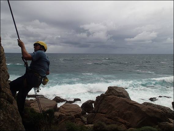Another rope came down Steel Wall, again blown horizontally. Then after I’d rapped down to get ready for our next route, I could hear screams of excitement and enjoyment as someone abseiled down at rapid speed. No it wasn’t Steve, but the abseiler hooning down Steel Wall. To be honest we didn’t expect to see anyone else out today, so much as I don’t understand abseiling for abseiling sake I thought good on them for getting out despite the forecast. As Steve came down at a more gentle rate, we were discussing whether we were right in thinking the wind was picking up speed: