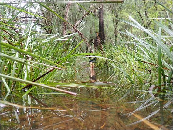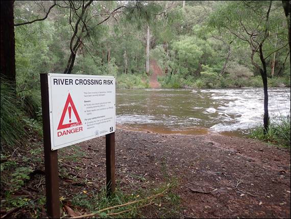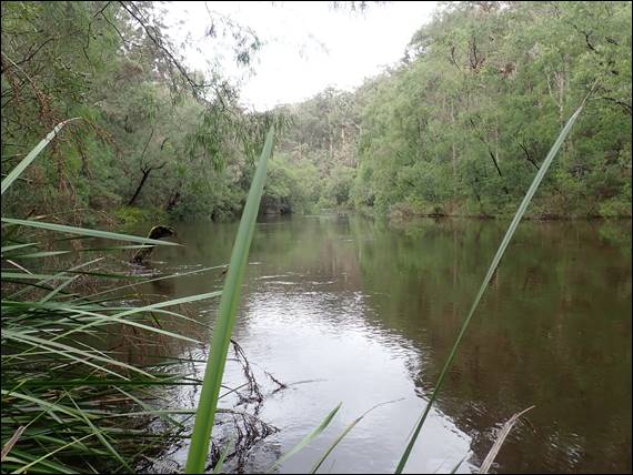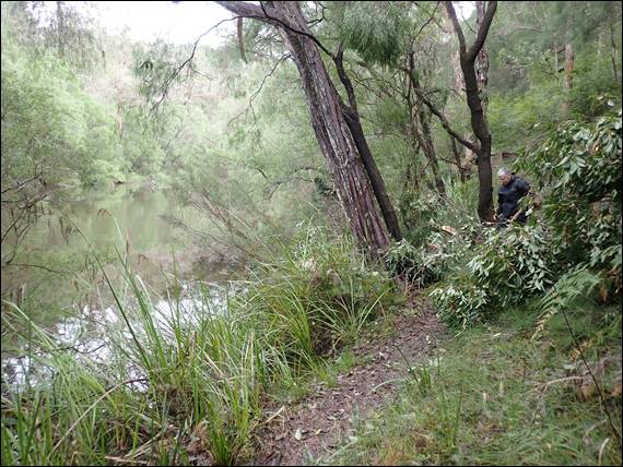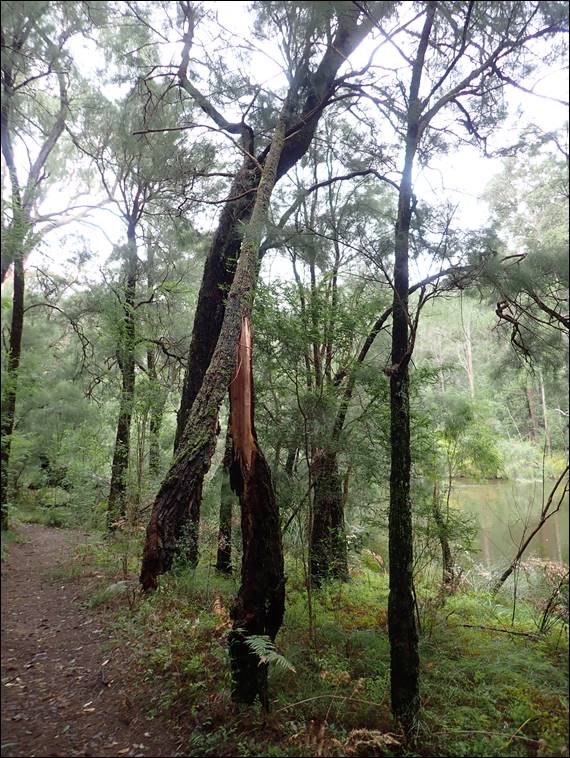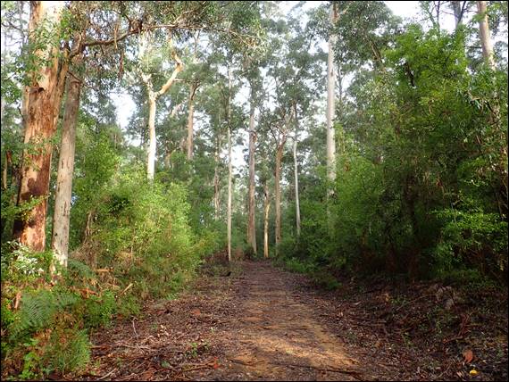 The forest also had many Marri and Jarrah trees, in fact the Jarrah (above) were more prominent along the river section. Only growing to forty meters these are again distinguishable by the trunk, which comprised a vertical deep grooved texture that looks to be fibrous in nature. The one above gave into the winds, in part as the lower section looked to have been munched on by termites reducing its structural integrity. I’ve got no image of a Marri in this post, maybe next time but for now back to the track, which at this point disappeared under water: