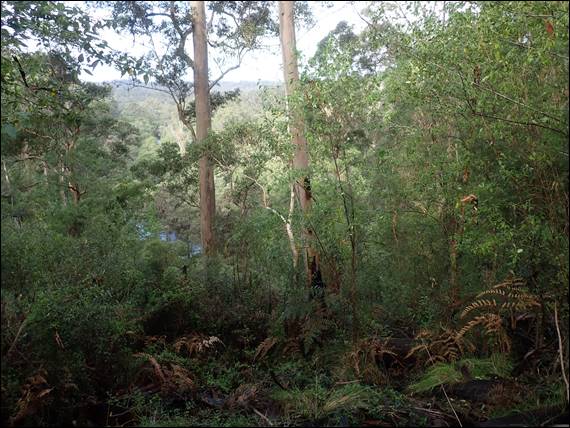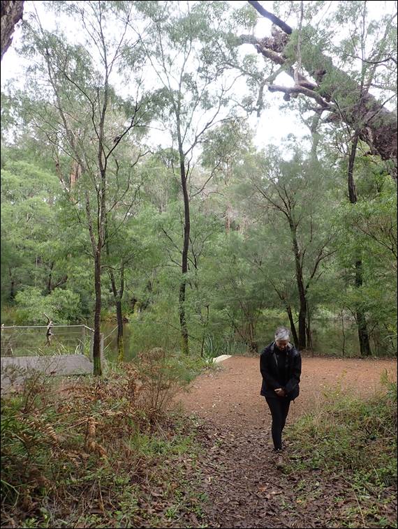 The Warren National Park offered a reasonable loop walk comprising a ten kilometre hike that took us on a journey through the Karri forests and along the Warren River. The vegetation was very different to what we had experienced up near Collie, and the undergrowth was thick and lush with ferns, grass tress and many shrubs. We came across the same saplings we found in Collie, the ones that looked like a broadleaf and seemed in Collie’s drier landscape to be invasive, so we took this image and I hope Howsie may be able to let me know what plant it is: