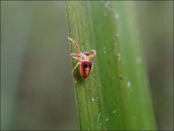 There were numerous locations where small tributaries flowing down the side of the valley joined the Warren River. To help cross these logs had been placed, with the upper section flattened, some with hand rails and some without. This one without was the only one fully submerged, knee deep for me and closer to thigh deep for Lisa. So we had to not only take our shoes off but also bear our legs, as we waded across. I’m always keeping an eye out for finds great and small, and while I appreciate it is winter it does surprise me at how few insects I see. But I did somehow spot this two millimetre long spider, as it floated across to and then latched onto this reed: