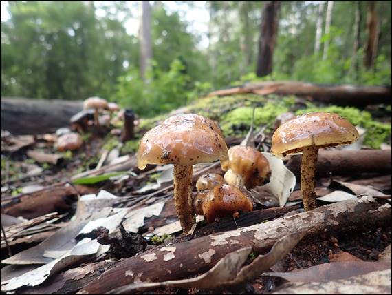 I feel like the fungi field guide Verity put me onto, along with a few others I have dug out, are starting to become more useful. Maybe also my eye is becoming trained of what to look for. As we were about to head off a laughing kookaburra swooped down from its previously unnoticed perch, and scooped up a worm. We sat and watched it for a while as it wasn’t afraid of us. Hinting that it was used to people being about and we wondered if was waiting for us to leaving something tasty behind, which we didn’t as there is plenty of natural food about for it. If you look carefully in the image below you may see it: