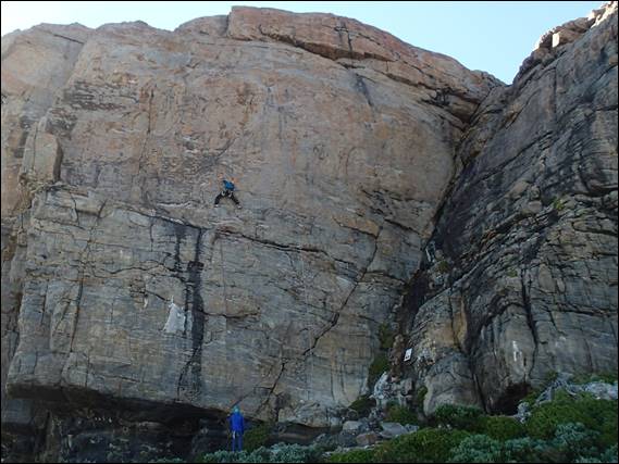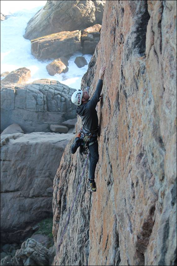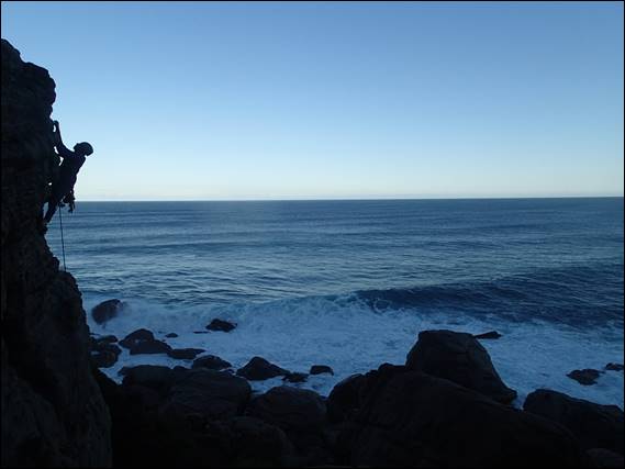 So once we were all atop the cliff and pondered what next, Dan plumped for Stainless Steel. Not quite the lofty grade 23 we might have been up for, but still a solid route and after the last two it would be enough. Opting not to be a mountain goat for a second time to get images, I took over Rongy’s position and lay on the boulders in the sun. Geez it was lush, kicking back and almost feeling like I could have had a snooze. In front of me Dan was strutting his stuff on the wall and behind me I could hear the crashing waves, it’s a good life for sure: