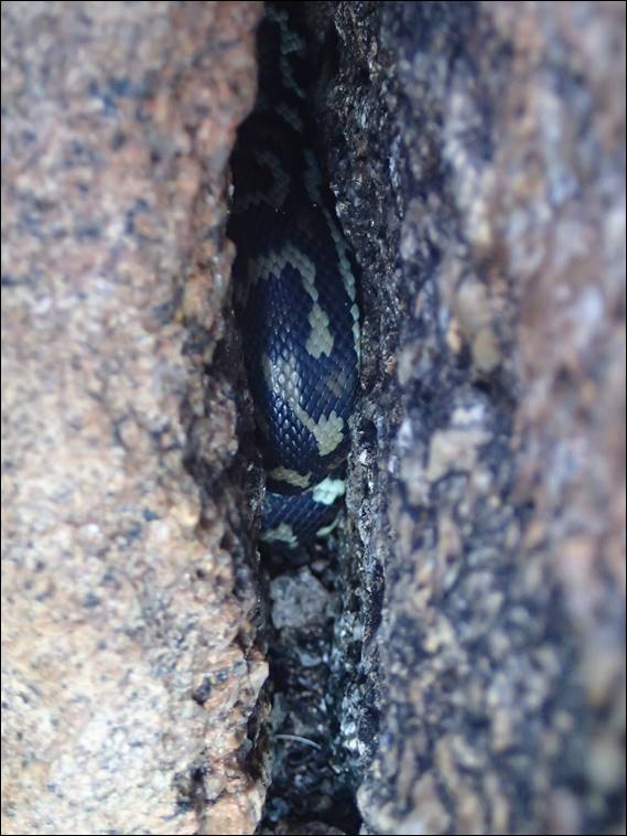 All of Dan’s keyboard bravado before this trip, about these lofty climbs, was soon dispelled. He was keen to ease into the day with some more moderate routes. This started with him taking the rope to lead Glory, almost ten grades less that what we were thinking. But grades don’t really matter, it is being out here that counts. That and the opportunity to meet old friends like this Carpet Python that was tucked behind one of the flakes on Glory, which neither Dan nor Rongy spotted. Mind you they did get to spot the dolphins cruise past, which I missed: