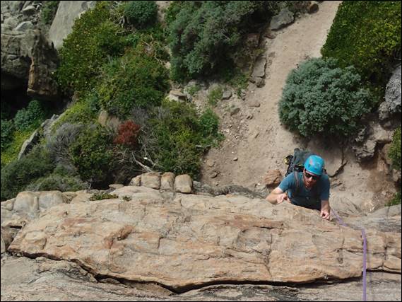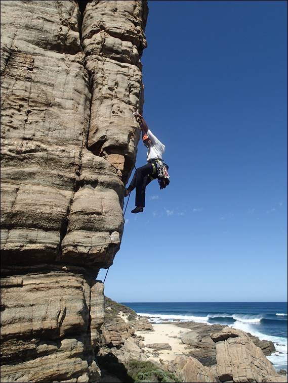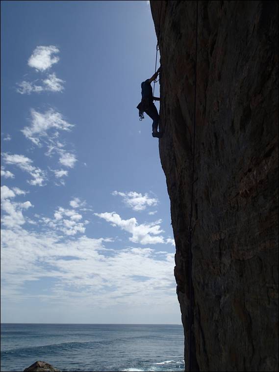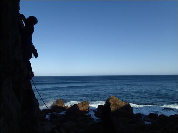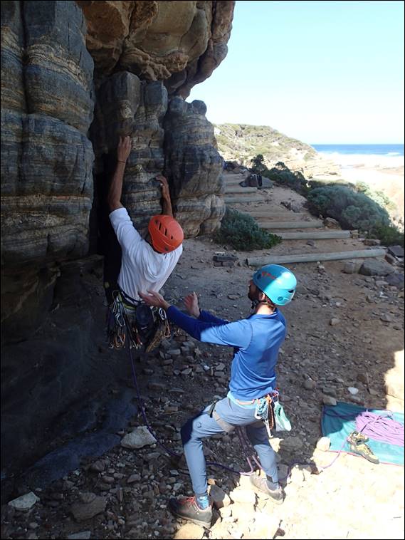 The reason for Jaime not being in many images is in part due to her having the camera while the exciting activity of leading was going on. She didn’t intend to stay with us all morning, but while she was we picked routes that she could reasonably have a crack at. This was however not the case for where I suggested Dan go next. A wall at Wilyabrup that rarely gets much attention, maybe because the routes are broken by a huge picnic ledge. But they are still good fun and offer a style of climbing that is quite different, another possible reason people don’t climb these routes. Dan really enjoyed it but Jaime no so much, although while Dan was watching she did spot whales one of which fully breached numerous times so not all was lost: