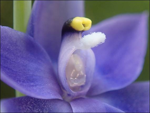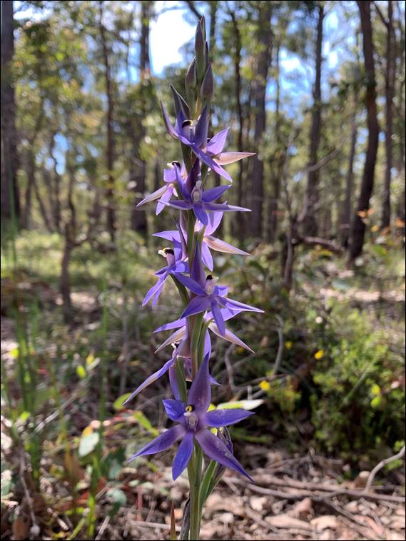 We did pretty well and found seven or eight species of orchids on the walk, all of which we had previously seen or so we thought. If you look closely you will see a couple of Purple Enamels in the background of the image of a Pansy Orchid. The close up above and below are of the Scented Sun and then Blue Lady Orchid, and I purposely took the close up images to show the difference in the column and tufts. The Scented Sun Orchid being the most common of the sun orchids, and can grow up to a meter in height and have upwards of fifteen flowers on one stem: