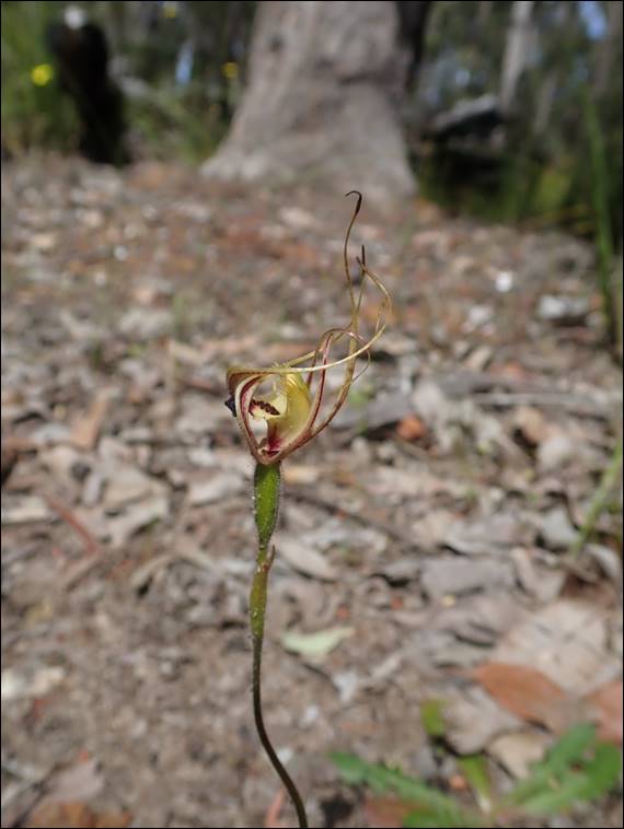 As I said we did pretty well on the Orchid front, and in addition to the above mentioned finds we saw Cowslips, Rattle Beaks, a single White Spider and several Forest Mantis. The latter were getting on in life and shrivelling up. While there are so many varied shapes and sizes of orchids in the South West of Western Australia, there is one thing in common and that is at the base of the flower is where the ovary sits. It is possible to tell if pollination has been successful, as the green pod between the stem and the flower will swell up: