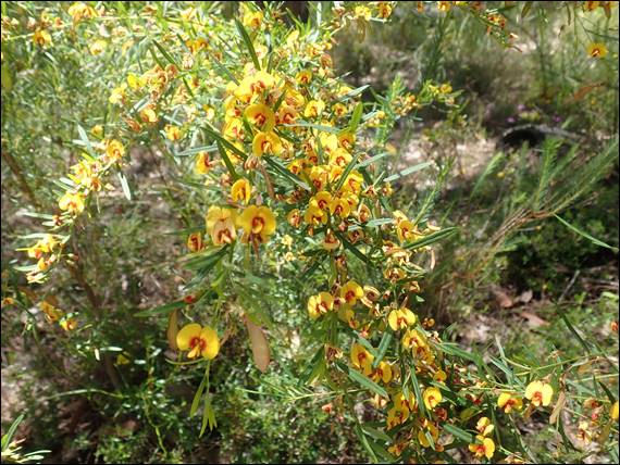 To my untrained eye I’m going to take a stab and say the above Forrest Mantis was not successful with reproduction, which I say because for some other orchids I’ve seen the ovary has been very noticeably swollen and looking back at other images of Forest Mantises this one isn’t. Below was a pea that stood out for me, due to the tight cluster and the deep colours of the flowers. It seems this plant, endemic to the south-west of Western Australia (again!), has had a name change over the years. Originally named Burtonia conferta in 1825, and changed in 1987 to Gompholobium confertum: