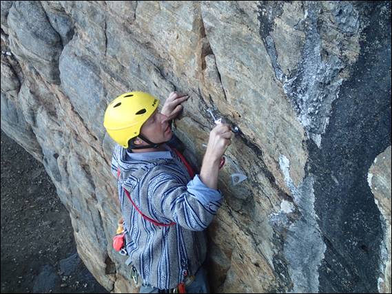 Due to the route he’d picked I only allowed Steve to put tricams on his harness, which I knew he wouldn’t mind. For those more familiar with climbing protection, you may recognise the wired tricams Steve is fiddling with above. The only other person I know who has these being Wiggins, and after one outing they never saw the light of day again. But when Steve stumbled across these without knowing about Wiggins nor my experience of them, just like the appeal of Orryjohn today he simply had to have some. It was to be their first outing, and the question is whether they will make it out again: